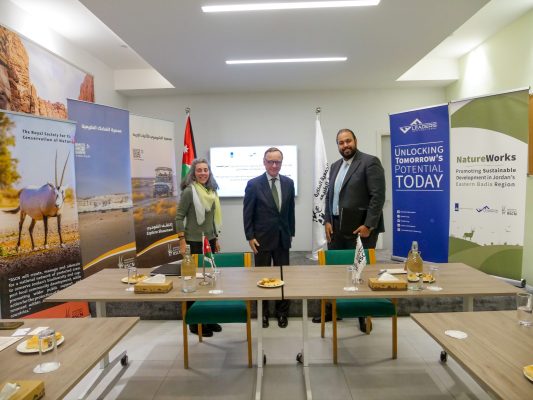بحضور كل من سعادة سفير مملكة هولندا في الأردن، السيد هاري فيرفاي، ورئيس مجلس إدارة الجمعية الملكية لحماية الطبيعة السيدة بتول العجلوني، ومدير عام الجمعية الملكية لحماية الطبيعة السيد فادي الناصر، ومدير عام مؤسسة ليدرز الدولية في الأردن السيد حمزة الشمايلة، تم توقيع اتفاقية تعاون تهدف إلى تنفيذ مشترك لمشروع “عمل الطبيعة” في البادية الشرقية في منطقة الأزرق.