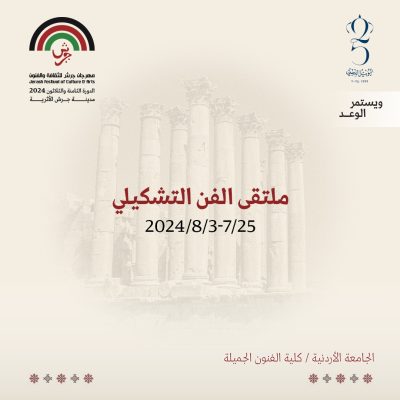 تنطلق صباح يوم الخميس المقبل (25 تموز 2024) في ساحة كلية الفنون والتصميم بالجامعة الأردنية، أعمال “ملتقى الفن التشكيلي”، الذي ينظمه مهرجان جرش للثقافة والفنون بدورته الـ38 التي تحمل شعار “ويستمر الوعد” وتأتي محملة بأبعاد وطنية، بالتعاون مع رابطة الفنانين التشكيليين الأردنيين، بمشاركة 38 فناناً من الأردن والدول العربية.