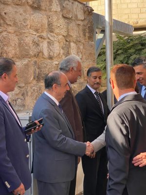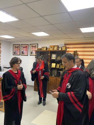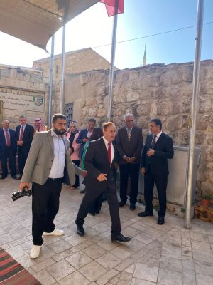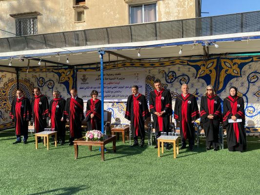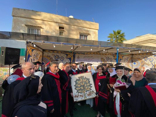 طلبة “فوج اليوبيل الفضي” في معهد مادبا لفن الفسيفساء والترميم بحضور محافظ مادبا فيصل المساعيد، وأمين عام وزارة السياحة فادي بلعاوي، ورئيس بلدية مادبا الكبرى عارف الرواجيح، ورئيس مجلس محافظة مادبا سالم الهروط، ورئيس بلدية جبل بني حميدة محمد الشخانبة، ونواب وأعيان المحافظة، ومدراء الدوائر الرسمية وأهالي الخريجين
