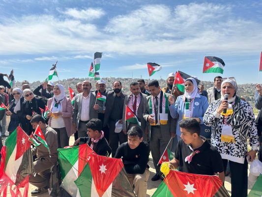 رفرفت الأعلام الأردنية في سماء المسيرة، التي حملت مشاعر الاعتزاز بالوطن وقيادته الهاشمية المظفّرة، في مشهد عبّر عن وحدة الصف الوطني وتعزيز قيم الولاء والانتماء للوطن والقائد.