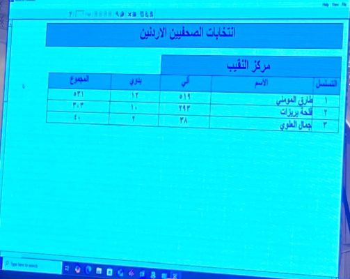 أعلن رئيس لجنة انتخابات نقابة الصحفيين الأردنيين، محمد التل عن تشكيلة المجلس الجديد والتي جرت مساء اليوم الجمعة في قاعة مدينة الحسين للشباب بعمان وضمّت كلاً من :-