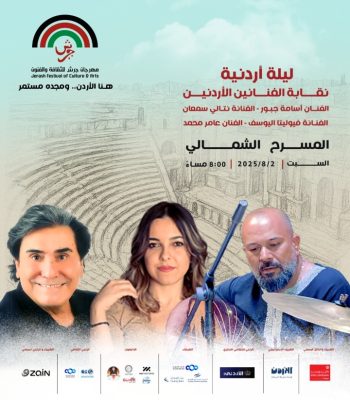 تحيي نقابة الفنانين الاردنيين حفلا فنيا كبيرا على المسرح الشمالي لمهرجان جرش 2025 وذلك عند الساعة الثامنة من مساء يوم السبت الموافق 2/8/2025 يشارك فيه الفنان اسامة جبور والفنانة نتالي سمعان و الفنانة فيوليتا اليوسف والفنان عامر محمد .