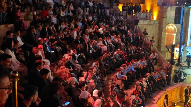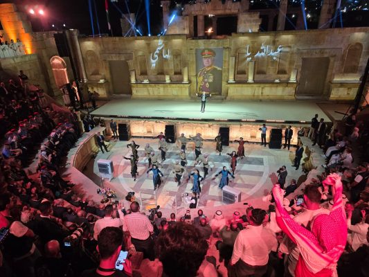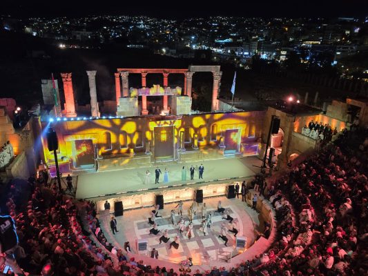 جلالة الملك عبد الله الثاني،ولي العهد الأمير الحسين بن عبد الله الثاني،العلم الأردني،شعار المهرجان: هنا الأردن، ومجده مستمر،ومعالم من المدينة الأثرية العريقة في عرض جمع بين الإبهار البصري والدلالة الرمزية، جاء بحضور دولة رئيس الوزراء الدكتور جعفر حسان، ومعالي وزير الثقافة مصطفى الرواشدة، إلى جانب حشد من الضيوف العرب والأجانب، ليكون لحظة خالدة في ذاكرة المهرجان.