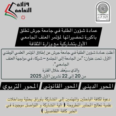 بدأت التحضيرات الأولى لعقد  المؤتمر العلمي الوطني الأول، تحت عنوان: “ إلى المجتمع – شركاء في مواجهة العنف ”، والذي سيُعقد خلال الفترة من 20 إلى 22 تشرين الأول 2025، في مدرج صلاح الدين في جرش