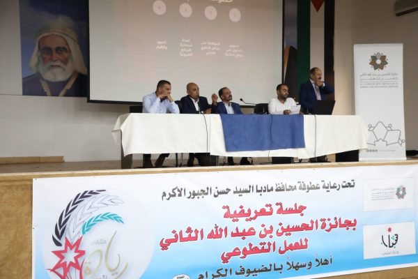 نظمت مديرية شباب مأدبا، برعاية مساعد محافظ مادبا بدر الخوالدة، ومدير شباب مادبا نمر الغنانيم وممثلين عن المؤسسات الرسمية والجمعيات الخيرية، وعدد من أصحاب المبادرات التطوعية في المحافظة. لقاءً تعريفيًا بجائزة الحسين بن عبدالله الثاني للعمل التطوعي في دورتها الثالثة،