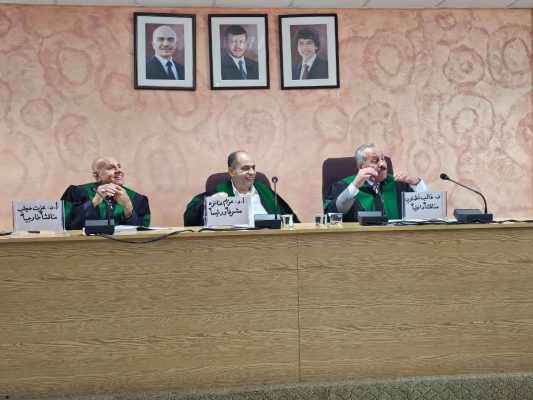 وقد تكونت لجنة المناقشة من الأستاذ الدكتور عزام العنانزة مشرفًا ورئيسًا، والأستاذ الدكتور عزت حجاب مناقشًا خارجيًا والدكتور غالب شطناوي مناقشًا داخليًا، بحضور رئيس قسم الصحافة والإعلام الرقمي / رئيس لجنة الدراسات العليا الدكتور عصمت حداد.