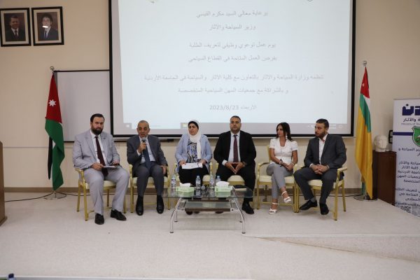 من جهته، قال عميد كلية الآثار والسياحة في الجامعة الأردنية الدكتور محمود العرينات، إن الكلية تؤمن وتسعى دائما لرفع مستوى طلبتها وتوعيتهم للحصول على فرص عمل في القطاع السياحي، إلى جانب رفدهم بالمهارات المطلوبة للانخراط في سوق العمل السياحي، مشدّدًا على أنّ انعقاد اليوم التوعوي الوظيفي في هذا اليوم يُعدّ خير مثال على الشراكة الفاعلة والتعاون المثمر الهادف إلى تمكين الطلبة وتنمية القدرات المطلوبة للعمل في القطاع السياحي.
